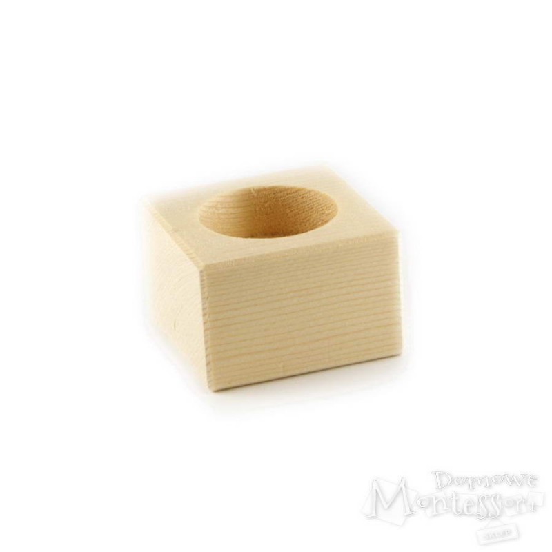 Niewysoki, drewniany świecznik z okrągłym otworem doskonale nadaje się do wykonania memo dotykowego. Wystarczy do dwóch świeczników wkleić ten sam materiał: piasek, koraliki, fasolkę, a dziecko za pomocą zmysłu dotyku wyszukuje parę. Świecznik nadaje się do ozdabiania różnymi technikami plastycznymi.