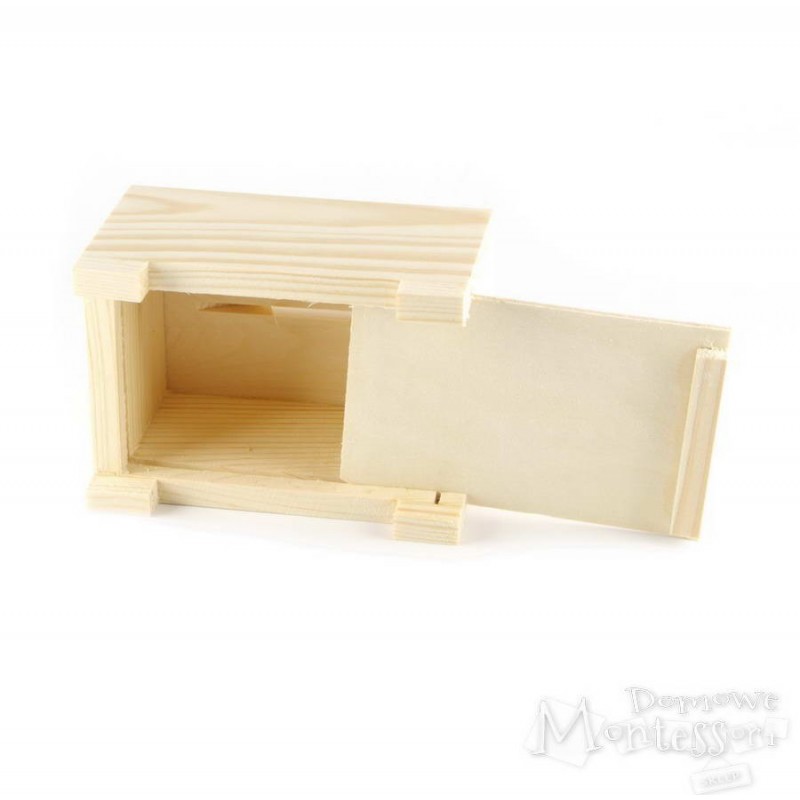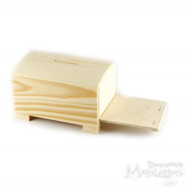 Skarbonka z drewna i sklejki ma ciekawy kształt i nadaje się do zdobienia. Dziecko może ją pomalować, okleić i nadać jej osobisty wygląd, a potem gromadzić w niej swoje oszczędności. Kuferek można też wykorzystać do innych zabaw lub zrobić z niego dekorację.