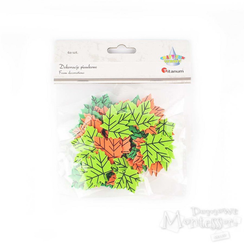 Sylwetka liścia wycięta z pianki – piankowe ozdoby w różnych kolorach to sposób na ozdobienie okna, drzwi czy wykonania kreatywnej pracy plastycznej z okazji wiosny lub jesieni. Zestawy pianek można też wykorzystać do ćwiczeń w sortowaniu i odtwarzaniu wzoru przygotowanego przez rodzica.