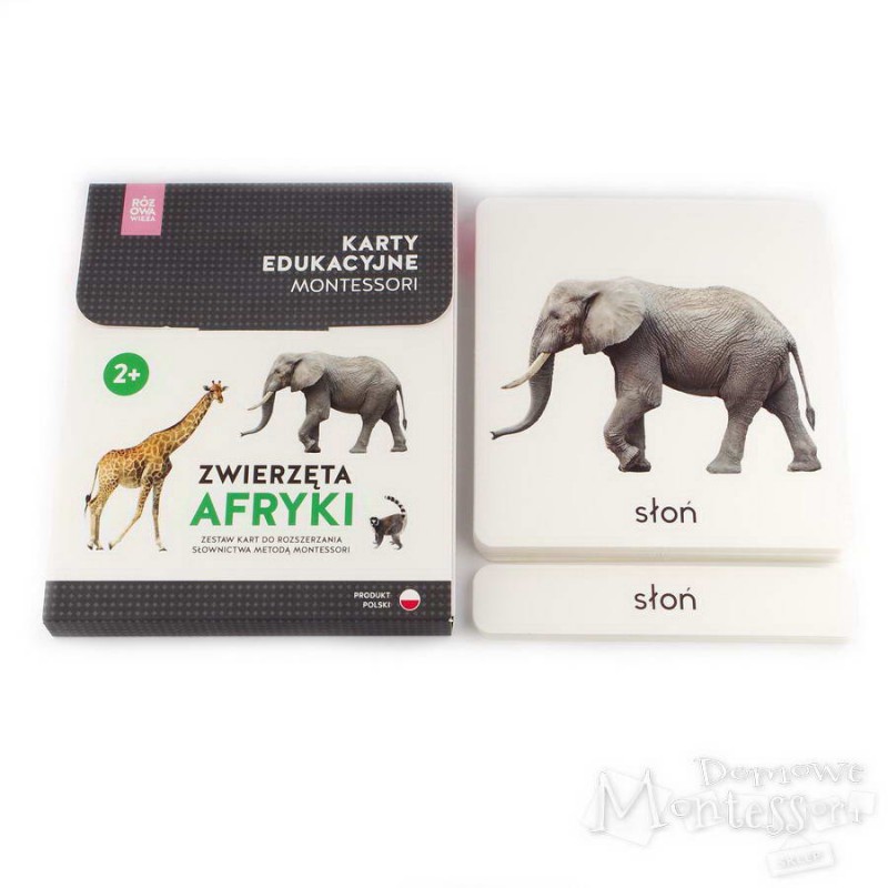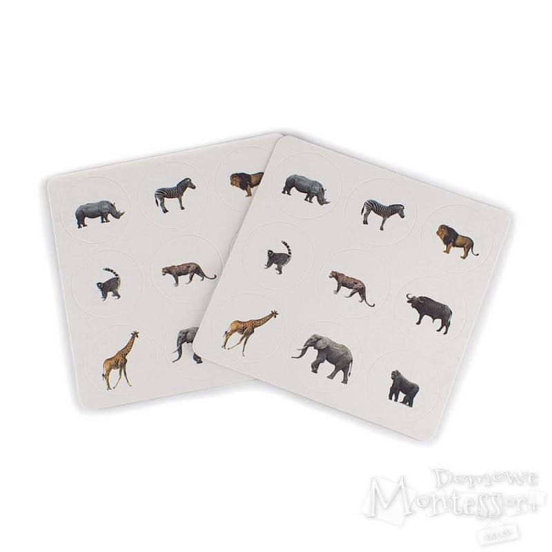 Sztywne, lakierowane kartoniki z kolorowym nadrukiem ułatwią naukę nazw i rozpoznawanie 9 afrykańskich zwierząt: bawół, lampart, goryl, lemur, lew, nosorożec, słoń, zebra, żyrafa. Zestaw składa się z kart z podpisem, kart bez podpisów i samych podpisów, co pozwala na stopniowanie trudności w zależności od wieku dziecka. Dodatkowo 2 karty na których znajdują się elementy do gry w memo.