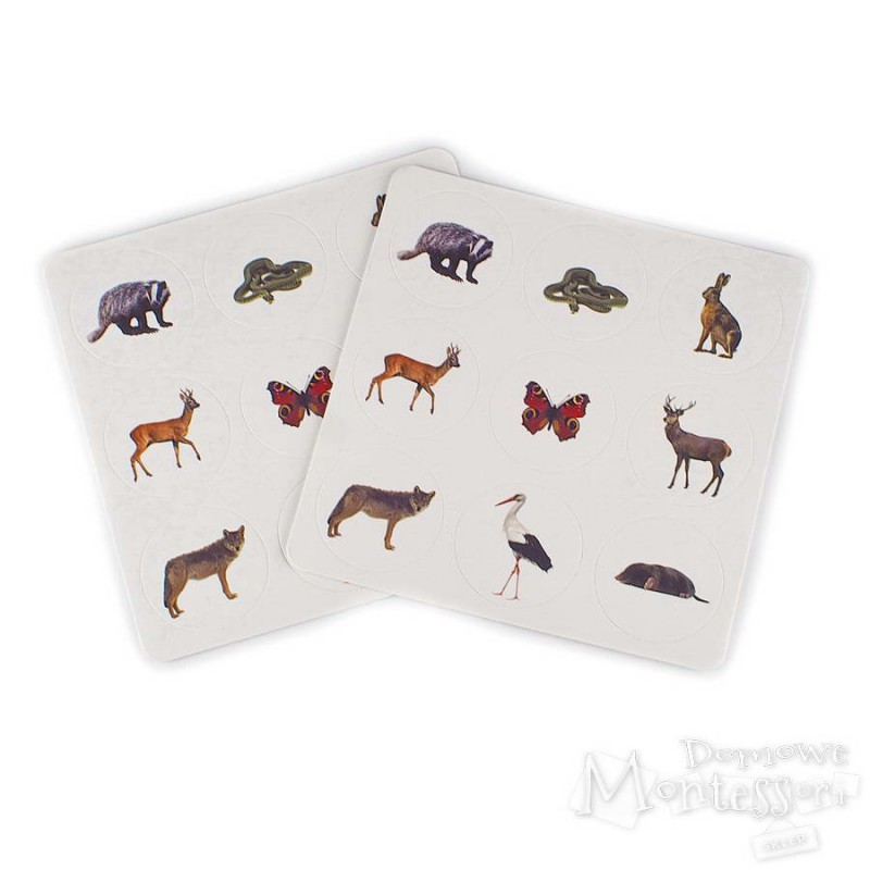 Sztywne, lakierowane kartoniki z kolorowym nadrukiem ułatwią naukę nazw i rozpoznawanie 9 zwierząt Europy: bocian, borsuk, jeleń, kret, rusałka pawik, sarna, wilk, zając, zaskroniec. Zestaw składa się z kart z podpisem, kart bez podpisów i samych podpisów, co pozwala na stopniowanie trudności w zależności od wieku dziecka. Dodatkowo 2 karty na których znajdują się elementy do gry w memo.