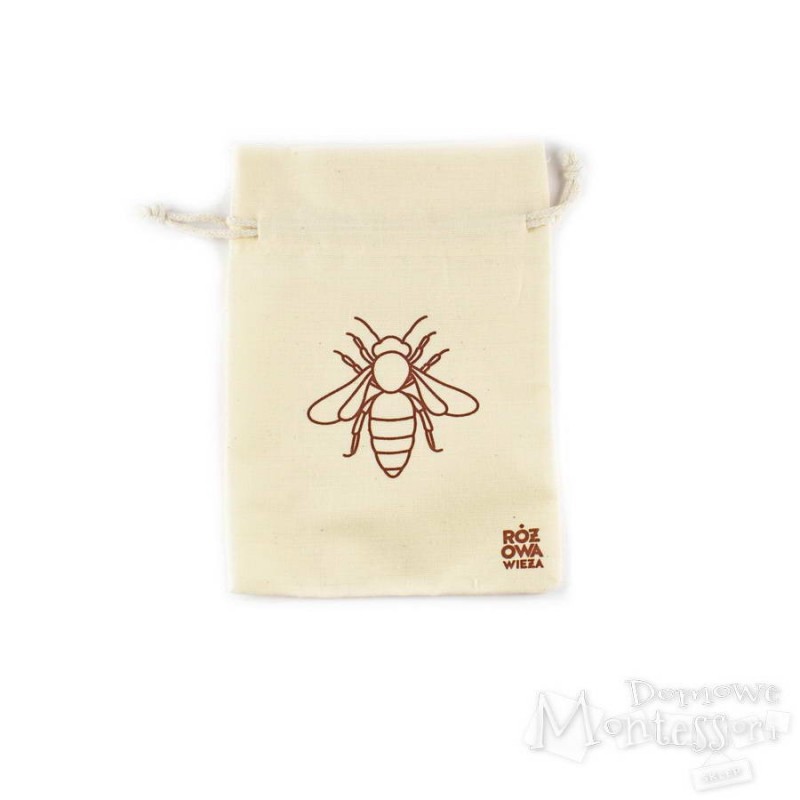 Woreczek jest rozmiarów 14×20 cm, w kolorze naturalnym, wykończony bawełnianym sznurkiem. Dostępny w kilku wersjach – z nadrukiem serca, motyla, pszczoły, fasoli, biedronki i much.