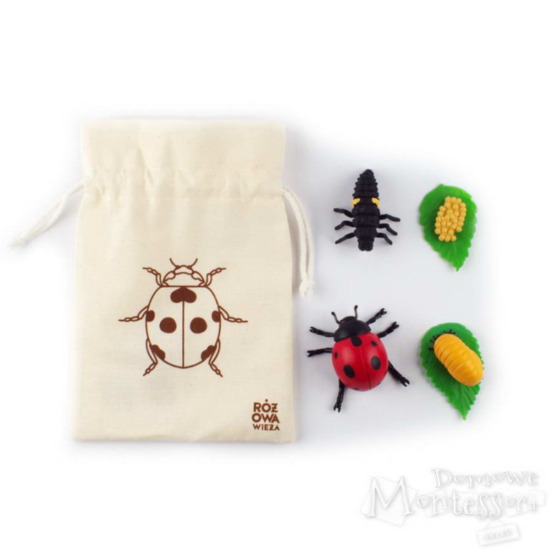 Jak z małego jajeczka powstaje kolorowa biedronka? Wykorzystując figurki przedstawiające rozwój biedronki dziecko może odgrywać scenki, ćwicząc przy tym umiejętność opisywania zjawisk i ucząc się o tym, jak rozwijają się owady. Zestaw umieszczony w praktycznym woreczku.