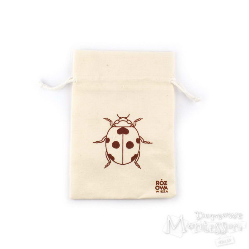 Woreczek jest rozmiarów 14×20 cm, w kolorze naturalnym, wykończony bawełnianym sznurkiem. Dostępny w kilku wersjach – z nadrukiem serca, motyla, pszczoły, fasoli, biedronki i much.