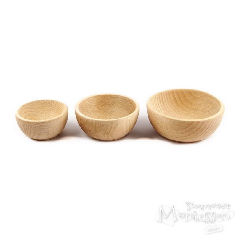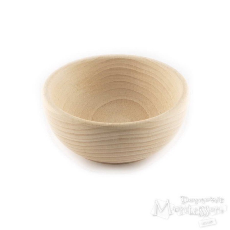 Piękna miseczka z naturalnego drewna ma wyraźny rysunek słojów i jest przyjemna w dotyku, więc dziecko chętnie po nią sięga. Można ją zabezpieczyć olejem lub pomalować. Miska przydaje się podczas ćwiczeń polegających na sortowaniu lub transferowaniu. Drewniane miseczki to także element zestawów Montessori (służą do przechowywania koralików w trakcie zadań matematycznych).