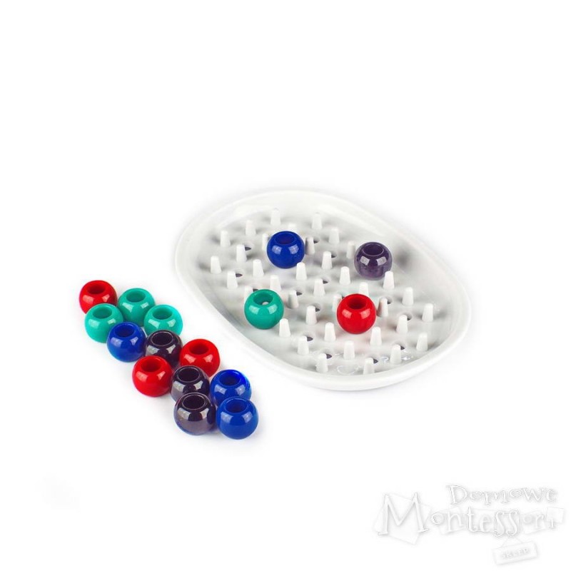 Zestaw składa się mydelniczki z kolcami i odpowiednio dobranych koralików, które do niej pasują. Dziecko przekłada koraliki i wzmacnia w ten sposób mięśnie ręki, a także ćwiczy precyzyjne ruchy tak potrzebne później przy pisaniu. Koraliki można też wykorzystać do nawlekania.