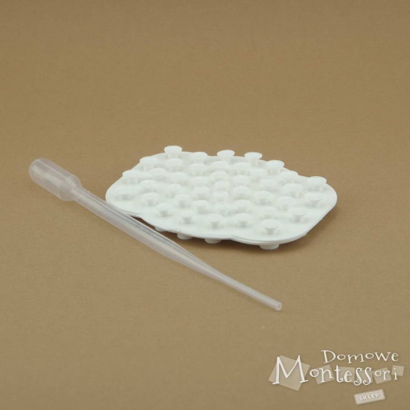 Zestaw do ćwiczenia umiejętności używania pipety zajmie dziecko na długo. Wystarczy przygotować kolorowy płyn i pozwolić dziecku na przenoszeniu go z naczynia do dołków w mydelniczce. Dziecko szybko uczy się, jak dużej siły musi użyć, oraz ile wody mieści się w każdym dołku.