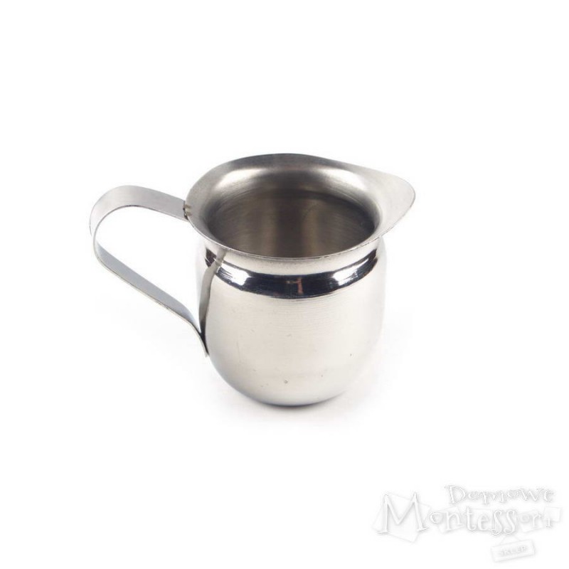 Nieduży dzbanuszek o oryginalnym kształcie, wykonany z metalu w kolorze stali nadaje się do serwowania mleka lub sosów. Jest również bardzo dekoracyjny. Może służyć dzieciom do nauki przelewania lub wchodzić w skład dziecięcego zestawu do zabawy w kuchnię – nie ma obaw, że dziecko go potłucze.