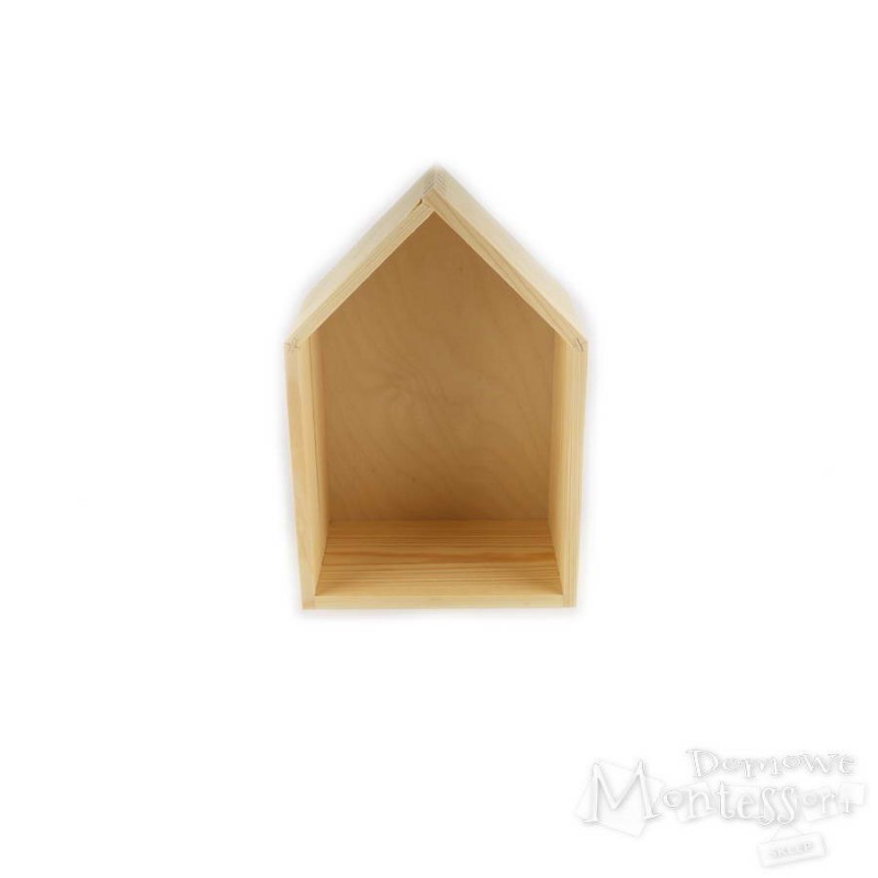 Dzięki tej ciekawej półeczce można w interesujący sposób wyeksponować wykonane przez dziecko przedmioty czy zebrane przez nie skarby. Jej oryginalny kształt wygląda atrakcyjnie w każdym pomieszczeniu. Drewniane ścianki i daszek można malować i oklejać lub zdobić techniką decupage.