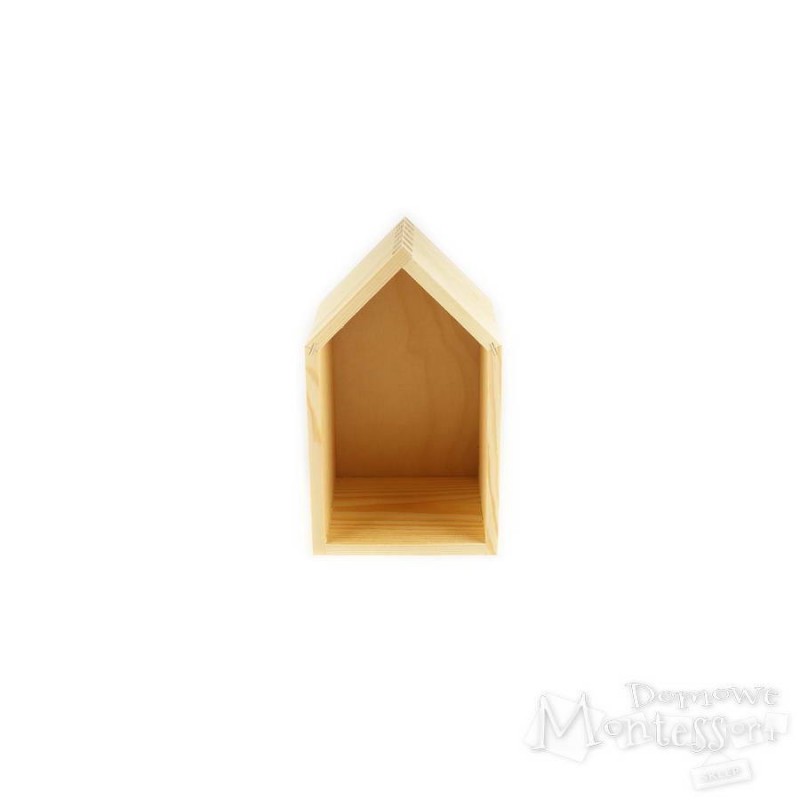 Dzięki tej ciekawej półeczce można w interesujący sposób wyeksponować wykonane przez dziecko przedmioty czy zebrane przez nie skarby. Jej oryginalny kształt wygląda atrakcyjnie w każdym pomieszczeniu. Drewniane ścianki i daszek można malować i oklejać lub zdobić techniką decupage.